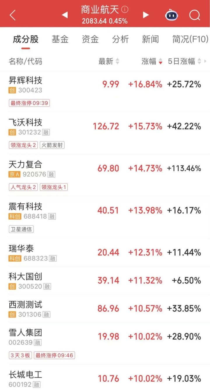 商业航天板块延续涨势,截至发稿,雪人集团、长城电工、中超控股、华菱线缆等多股涨停,昇辉科技开盘后迅速拉升实现“20cm”涨停,随后打开涨停板,截至发稿涨近17%。飞沃科技、震有科技、天力复合等涨幅居前。